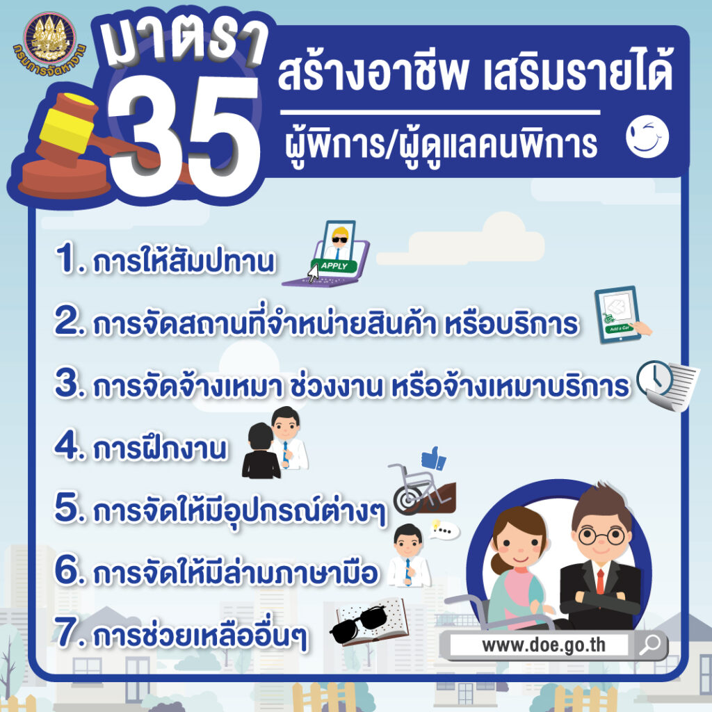 มาตรา 35 ในกรณีที่หน่วยงานของรัฐไม่ประสงค์จะรับคนพิการเข้าทำงานตามมาตรา 33 หรือนายจ้างหรือเจ้าของสถานประกอบการไม่รับคนพิการเข้าทำงานตามมาตรา 33 และไม่ประสงค์จะส่งเงินเข้ากองทุนตามมาตรา 34หน่วยงานของรัฐ นายจ้างหรือเจ้าของสถานประกอบการนั้นอาจให้สัมปทานจัดสถานที่จ าหน่ายสินค้าหรือบริการ จัดจ้างเหมาช่วงงานหรือจ้างเหมาบริการโดยวิธิกรณีพิเศษ ฝึกงาน หรือจัดให้มีอุปกรณ์หรือสิ่งอำนวยความสะดวก ล่ามภาษามือ หรือให้ความช่วยเหลืออื่นใดแก่คนพิการหรือผู้ดูแลคนพิการก็ได้ ทั้งนี้ ตามหลักเกณฑ์ วิธีการและเงื่อนไขที่คณะกรรมการกำหนดในระเบียบ