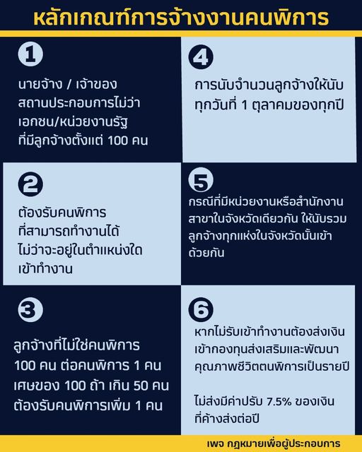 3. สัดส่วนของการรับคือ ลูกจ้างที่ไม่ใช่คนพิการ 100 คน ต่อคนพิการ 1 คน เศษของ 100 ถ้าเกิน 50 คน ต้องรับคนพิการเพิ่มขึ้นอีก 1 คน เช่น มีลูกจ้าง 151 คน ก็ต้องจ้างคนพิการ 2 คน