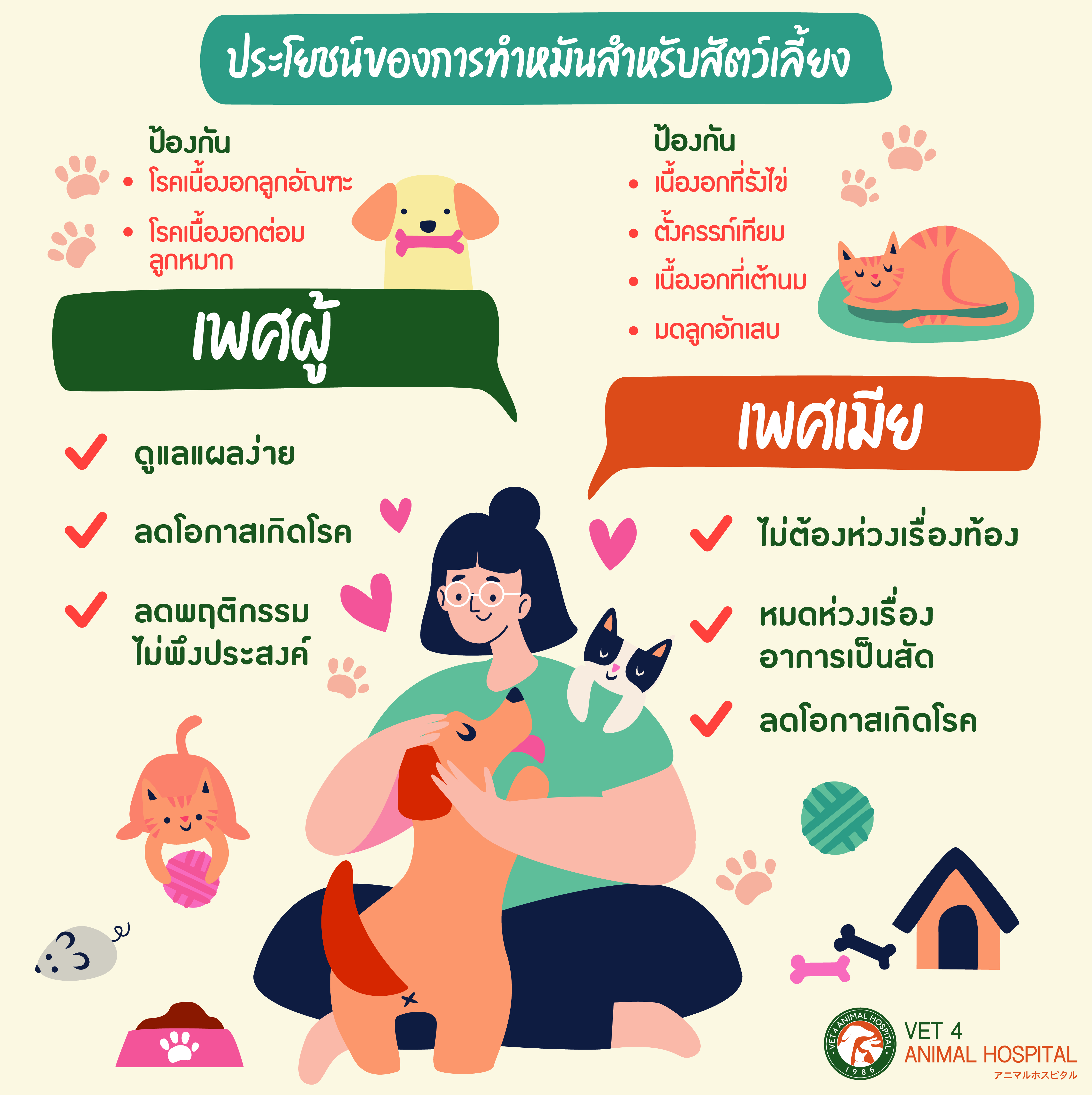 การทำหมันสุนัข ทำหมันแมว นั้น ไม่ใช่แค่การคุมกำเนิดถาวร แต่ยังมีข้อดีอื่น ๆ อีกมากมาย เช่น ลดอาการเป็นสัด ลดพฤติกรรมปัสสาวะไม่เป็นที่ ลดพฤติกรรมก้าวร้าว