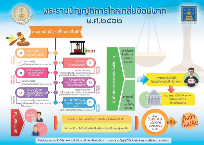 รายละเอียด : ศูนย์ไกล่เกลี่ยข้อพิพาทภาคประชาชนตำบลบางกะไชย อำเภอแหลมสิงห์ จังหวัดจันทบุรี แจ้งประชาสัมพันธ์แนวทางและวิธีการปฏิบัติ รวมถึงกระบวนการต่างๆ ในการไกล่เกลี่ยข้อพิพาท ตาม พรบ.การไกล่เกลี่ยข้อพิพาท พ.ศ. 2562 สอบถามข้อมูลเพิ่มเติม - สำนักงานยุติธรรมจังหวัด - กรมคุ้มครองสิทธิและเสรีภาพ สายด่วนยุติธรรม 1111 กด 77 ศูนย์ไกล่เกลี่ยข้อพิพาทภาคประชาชนตำบลบางกะไชย 039-397905 การยุติหรือระงับข้อพิพาททั้งคดีแพ่ง และคดีอาญาบางประเภท โดยคำนึงถึงความยินยอมของคู่กรณี เพื่อสร้างสังคมที่อยู่ร่วมกันอย่างปกติสุข